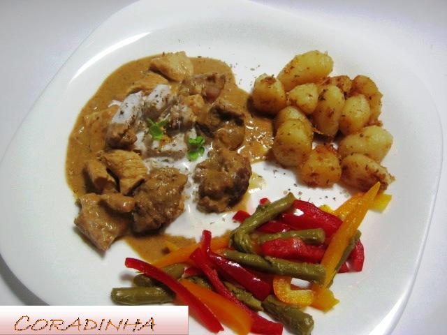 Hoje venho mostrar-vos uma vitelinha (ou vaca como lhe queiram chamar) com caril e côco e umas batatinhas de bradar aos céus! Por vezes quando me ponho a inventar sai asneira...mas nesta e nas próximas duas receitas até gostei do resultado, prova de que estava bom é que nem houve lugar a repetição porque as 1ªs doses acabaram logo com essa hipótese:)